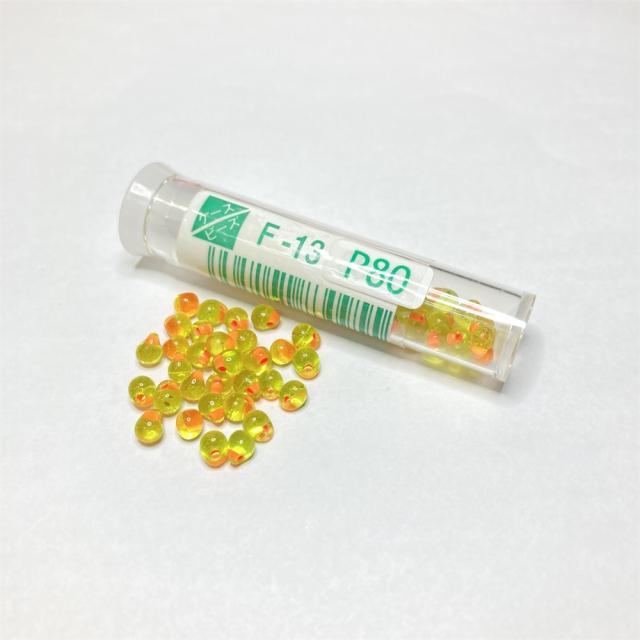 カラー番号:F13 カラー名:ペリドット中染 素材:ガラス 加工の種類:スキ、ツヤ有り、中染め サイズ:3.4mm DP 内容量:約55粒(ケースビーズ約3g)