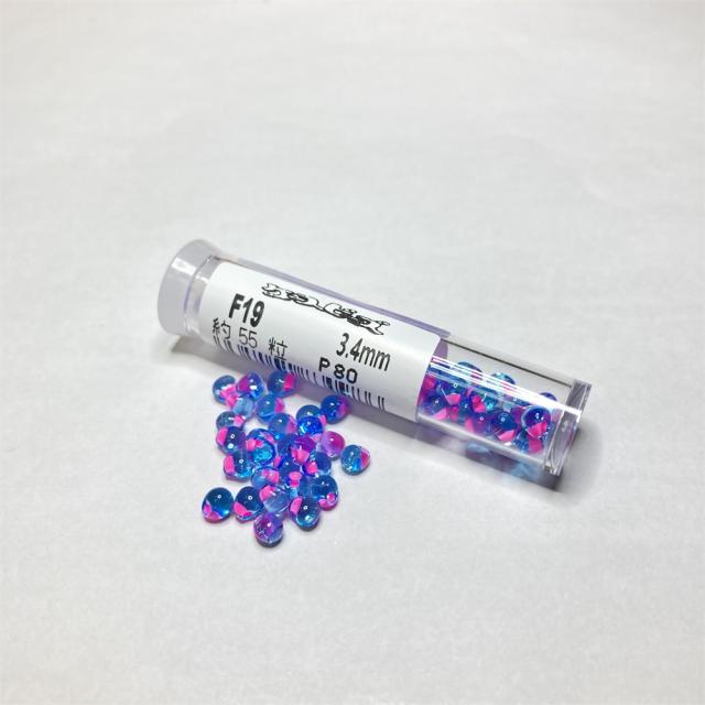 カラー番号:F19 カラー名:アクア中染 素材:ガラス 加工の種類:スキ、ツヤ有り、中染め サイズ:3.4mm DP 内容量:約55粒(ケースビーズ約3g)