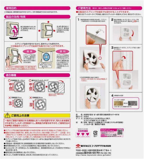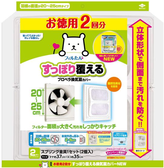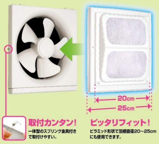 サイズ:タテ約37.5cm×ヨコ約35cm×厚み6cm 枚 数:2枚入り 重 量:約40g 材 質:枠部/塩化ビニル樹脂 (非フタル酸エステル系可塑剤) フィルター部/難燃性不織布 付属品:スプリング金具1セット(2個入) 換気扇を油汚れから守り、汚れを軽減します。 側面まで覆える立体形状です。 プロペラ換気扇は、油でよく汚れるため、 お掃除が大変です。 換気扇カバーを使うとフィルターで 油をキャッチすることができます。 備え付けフィルタータイプにも 取付することができます。 |