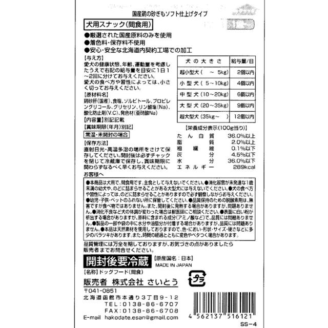 ・原材料名:鶏砂肝(国産)、食塩、ソルビトール、プロピレングリコール、グリセリン、リン酸塩(Na)、酸化防止剤(V・C)、発色材(亜硝酸Na)