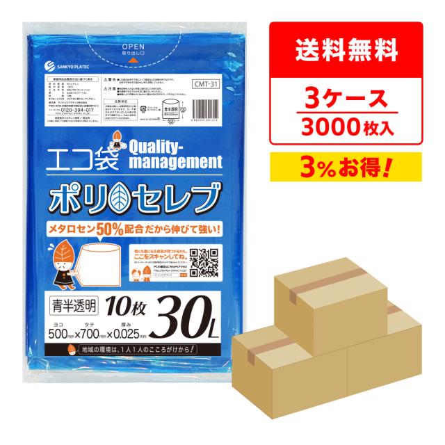 【まとめて3ケース】CMT-31-3 ポリセレブ ポリ袋 30リットル 0.025mm厚 青半透明 10枚x100冊x3箱/ ゴミ袋 ごみ袋 送料無料