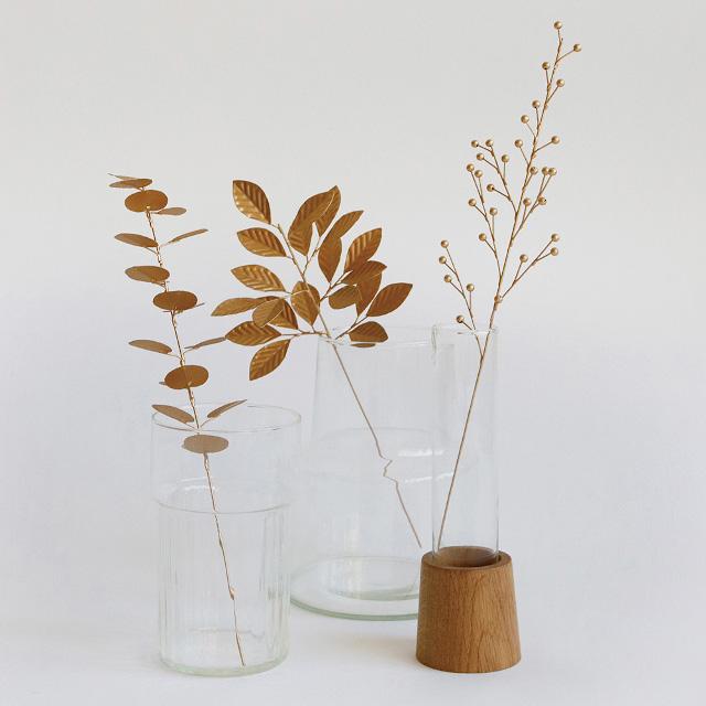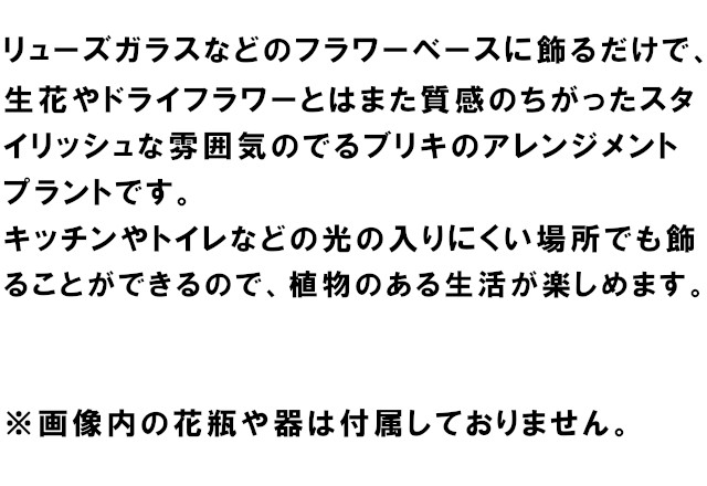 リューズガラスなどのフラワーベースに飾るだけで、生花やドライフラワーとはまた質感のちがったスタイリッシュな雰囲気のでるブリキのアレンジメントプラントです。 |