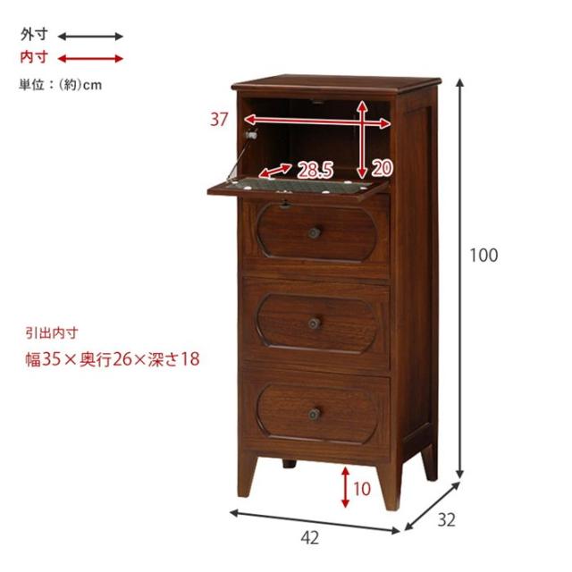 チェスト タンス 収納棚 木製 幅42cm 4段 スリム おしゃれ レトロ 上段フラップ扉 花柄モザイクガラス