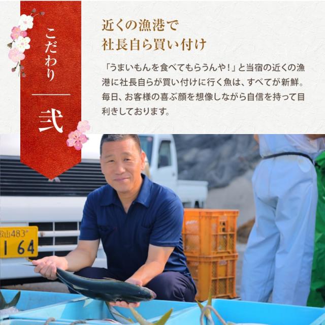 「うまいもんを食べてもらうんや!」と当宿の近くの漁港に社長自ら買い付けに行く魚は、すべてが新鮮。毎日、お客様の喜ぶ顏を想像しながら自信を持って目利きしております。