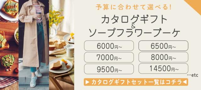 グルメや雑貨、お好きなものを選んでもらえるカタログギフトと枯れないソープフラワーのブーケ。