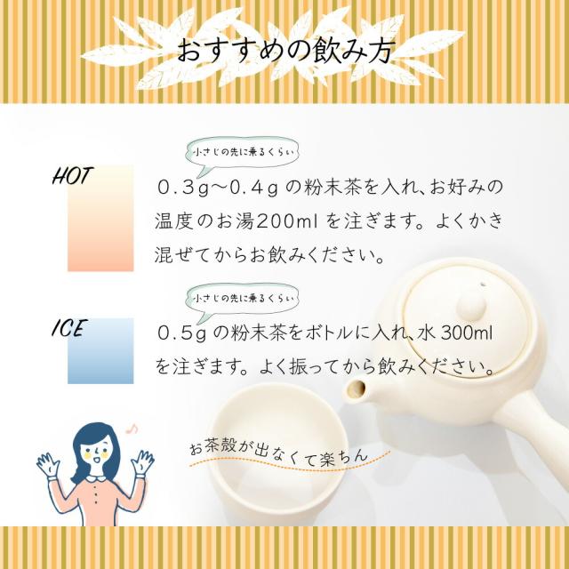 - 玄米茶の風味がして、とても美味しいです。粉が、細かく、水でもよく溶けます。色もきれいです。他社イロイロ試してますが、とても良いです。
