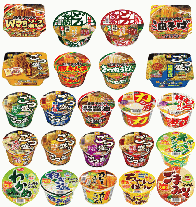 ガッツリ食べたい貴方に最高です。食べ盛りの子達にも色んな味が楽しめ、大変便利なセットです。画像の中から25個にしてお届けします。賞味期限は数か月ありますので安心ください。餅類のカップ麺は、冬場の限定になるため、タイミングで入りません。予めご了承ください。