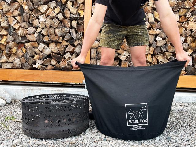 収納袋1つに焚き火大本体、脚部、五徳を収納できます。