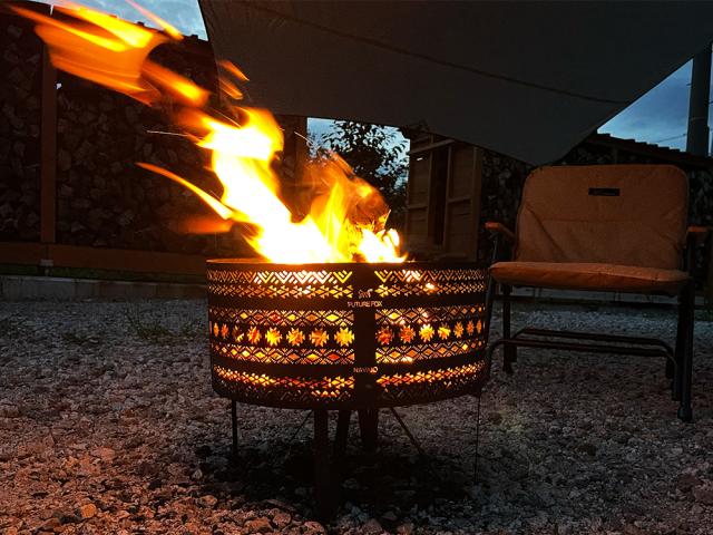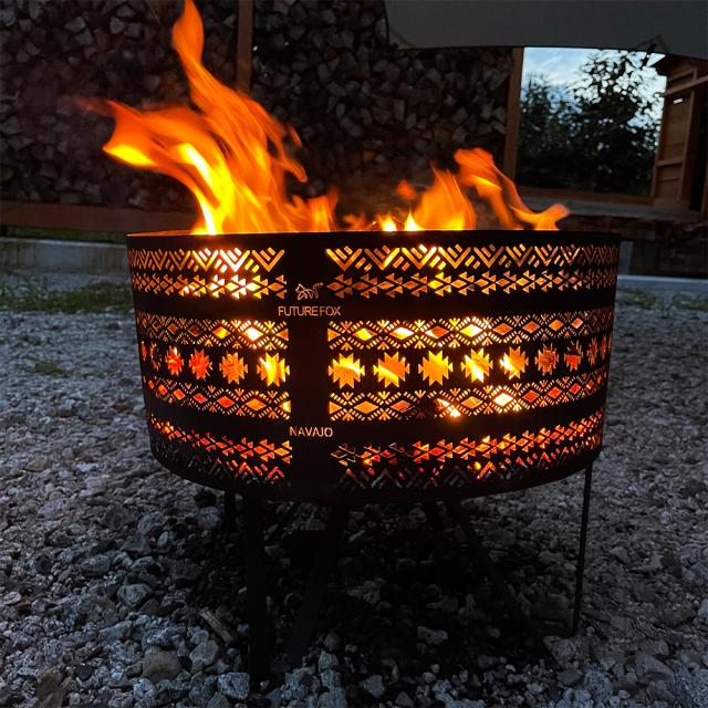 FUTUREFOX ナバホ柄焚き火台は名前の通り、焚火台側面全体にナバホ柄を透し彫りした焚き火台です。 焚き火自体を楽しむのはもちろん、たき火台から現れる赤く染まったアウトドアらしさのあるナバホ柄を鑑賞することもできるおしゃれなデザインに。 日頃のストレスなどを忘れ、キャンプでゆっくりと焚火を堪能していただきたいという思いを焚き火台に込めました。