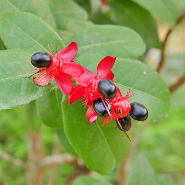 花後につける「黒」い実と「赤」く色づくガクの色の組み合わせからミッキーマウスの木と呼ばれるようになりました。実際の実の数は3個より多いためそう見えなくもない、、、程度ではあります。可愛らしい黄色の花と特徴的な実が鑑賞できる珍しい庭木です。耐乾性はあまりないため鉢植えにしたほうが良いでしょう。