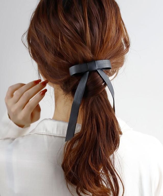 甘くなりがちなリボンも、レザー調の質感が大人っぽく上品な印象に導いてくれます。