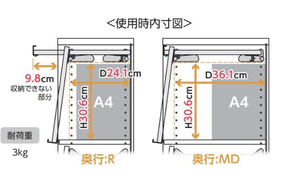 奥行レギュラーの本体に取り付けた場合、フラップ扉が9.8cm収納出来ない部分が発生します。別ページの本体ラック購入ページにて本体のサイズをご確認下さい。(本体の奥行はレギュラー、ミディアムディープの2種類があります。)