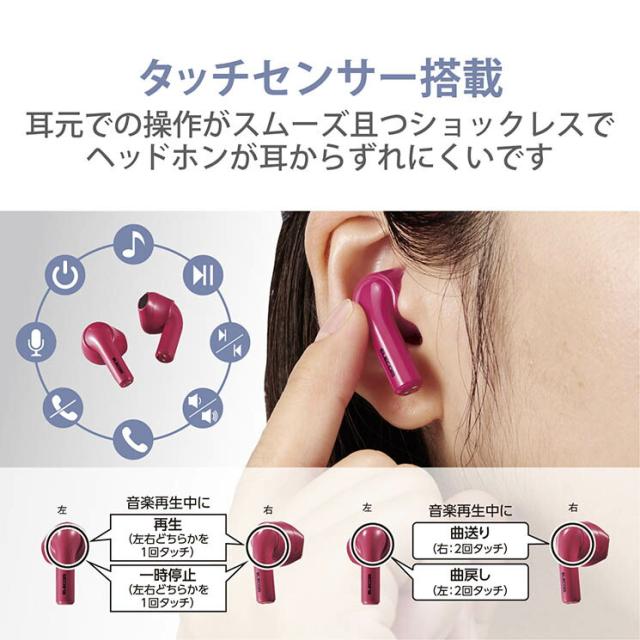 耳への負担が小さく、周囲の音や話し声を聞き取りやすいセミオープンタイプのBluetooth(R)完全ワイヤレスステレオヘッドホン。高音質コーデックAACに対応し、iPhoneなどのAACに対応したスマートフォンやプレーヤーで高音質な音楽が楽しめます。持ち運びに便利な小型充電ケース付き。■通信方式:Bluetooth標準規格 Version5.0 ■出力:Bluetooth Power Class2 ■最大通信距離:見通し 約10m ■使用周波数帯域:2.4GHz帯 ■変調方式:FHSS(周波数ホッピング方式スペクトラム拡散) ■対応Bluetoothプロファイル:A2DP,AVRCP,HFP ■A2DPの対応コーデック:SBC,AAC ■A2DPの対応コンテンツ保護:○:SCMS-T ■最大登録可能台数:8台 ■マルチポイント(同時待受け):非対応 ■再生周波数帯域(A2DP):20-20,000Hz ■連続再生最大時間:約4時間(約4時間+2回充電=最大約12時間) ■連続通話最大時間:約4時間(約4時間+2回充電=最大約12時間) ■連続待受最大時間:最大約70時間 ■電源:充電式リチウムイオン電池 ■定格電圧:DC5V ■充電時間:約1.5時間■質量:ヘッドホン部(片耳):約3.4g、充電ケース:約25.3g ■本体カラー:ピンク