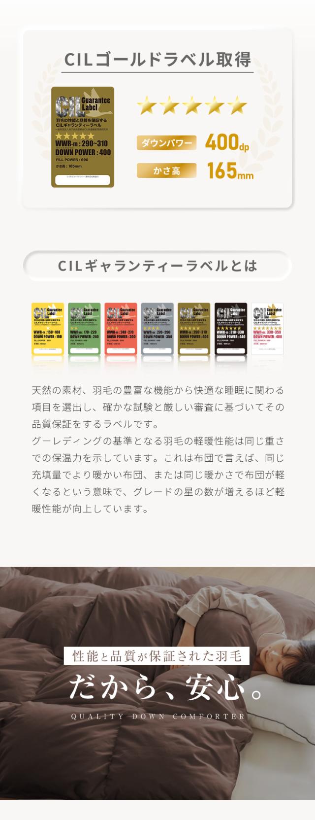 CILゴールドラベルを取得(かさ高165mm以上、ダウンパワー400dp以上)