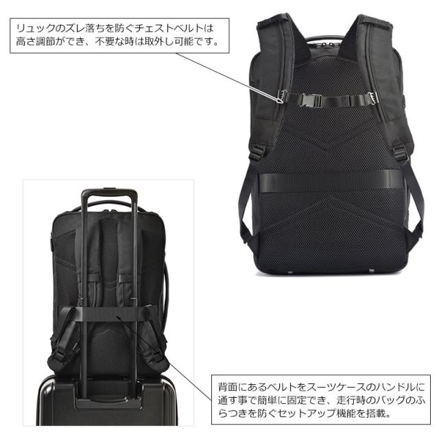 ● 背面にあるベルトをスーツケースのハンドルに通す事で簡単に固定でき、走行時のバッグのふらつきを防ぐセットアップ機能を搭載。