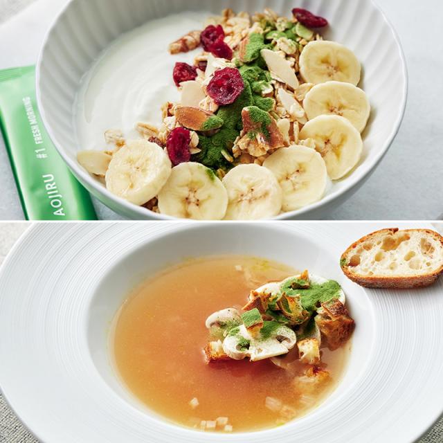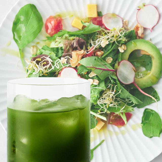 微粒子パウダーは水に溶けやすいだけでなく、ヨーグルトやスープに加えても粉っぽさを感じずにお召し上がりいただけます。グリーンのフレッシュな味わいと栄養素を手軽にプラスできます。