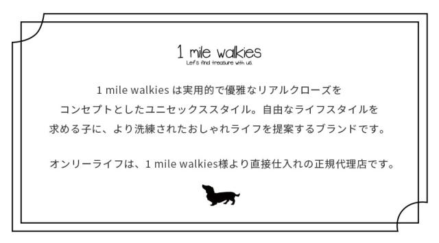 「1 mile walkies(ワンマイルウォーキーズ)」は実用的で優雅なリアルクローズをコンセプトとしたユニセックススタイル。自由なライフスタイルを 求める子に、より洗練されたおしゃれライフを提案するブランドです。