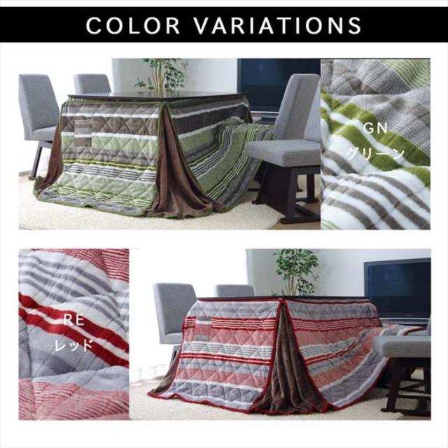 こたつ布団。ハイタイプ用。235x275cm。カラーは、グリーン(4550317015090:1181850123530)、レッド(4550317015137:1181850243530)、です。ジャガード織の凹凸感が特徴的な素材感があるこたつ布団です。お部屋の雰囲気気を崩さない淡い色目とカジュアルでお部屋に合いやすいストライプ柄にしました。ダイニング用のこたつ台にご使用いただけます。薄手なので折りたたんでもかさばらず、コンパクトに収納できます。部分暖房のコタツは電気代もおトクです。