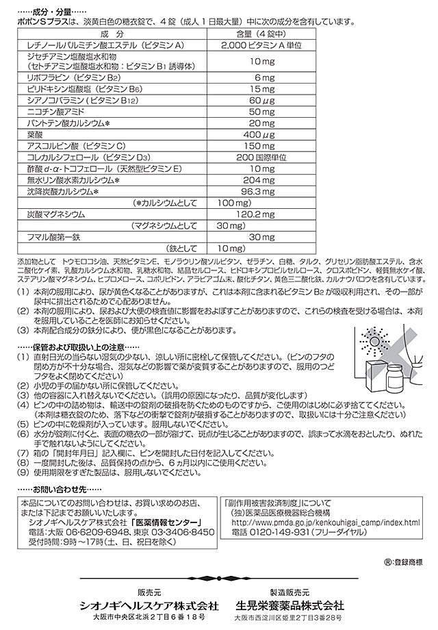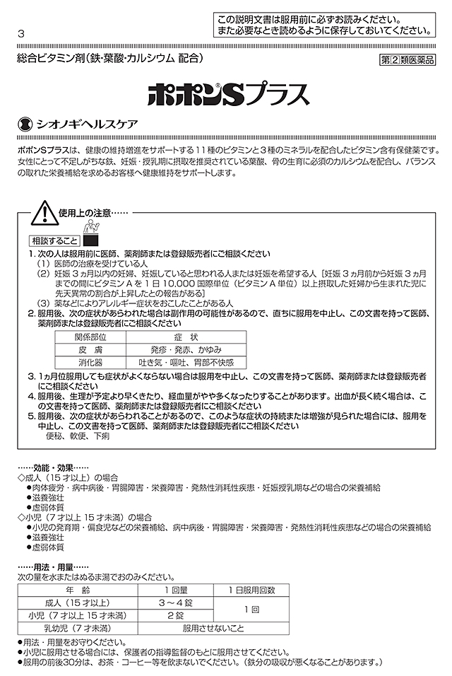 ポポンSプラスは、健康の維持増進をサポートする11種のビタミンと3種のミネラルを配合したビタミン含有保健薬です。女性にとって不足しがちな鉄、妊娠・授乳期に摂取を推奨されている葉酸、骨の生育に必須のカルシウムを配合し、バランスの取れた栄養補給を求めるお客様へ健康維持をサポートします。※こちらの商品は「医薬品」です。医薬品には、健康被害を避けて有効に使用していただくために用法・用量などの使用方法が定められています。用法・用量を超えて使用すると、重大な健康被害につながるおそれがありますので、必ず使用方法をお守りください。