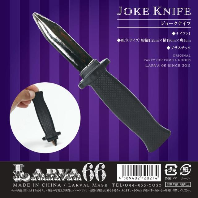 商品説明:刃の部分がひっこむジョークナイフ。プラスチックのおもちゃの為演劇、お芝居などでも使えます。