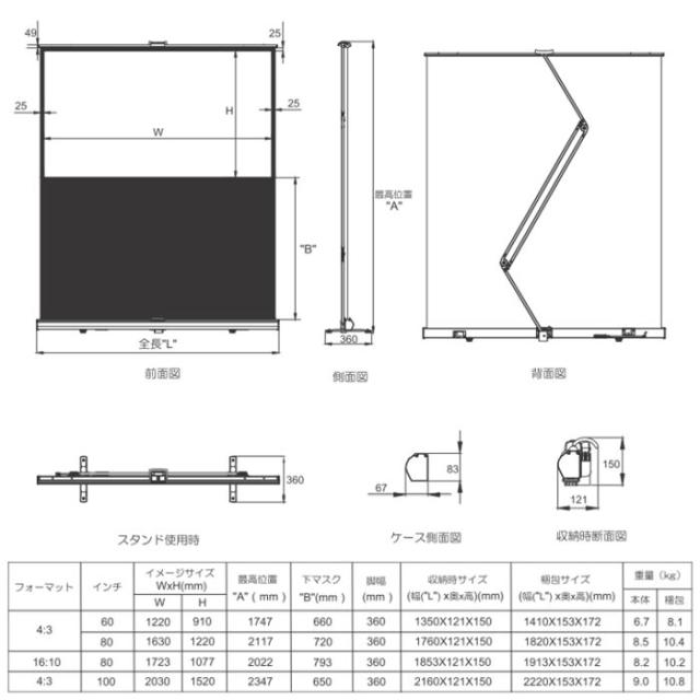 ■商品名:プロジェクタースクリーン モバイルスクリーン 80型 80インチ 4:3 1630×1220mm 簡単セッティング 軽量で持ち運びラクラク パンタグラフ方式
