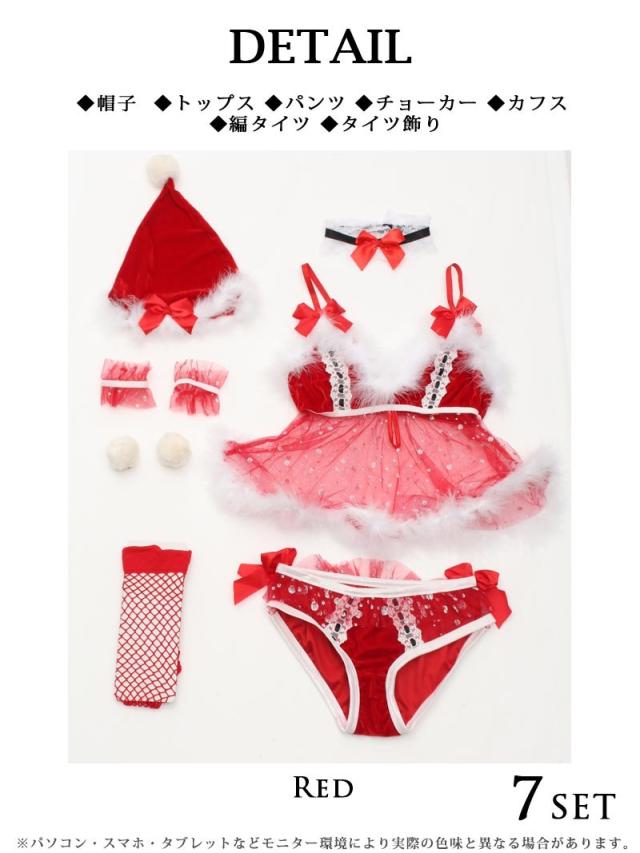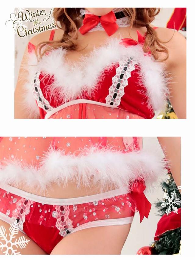 ☆まるで雪が散りばめられたようなデザインで透け感がセクシーなサンタコスは、リボンとファーの組み合わせでキュートさもプラスされたランジェリーコスプレセット♪