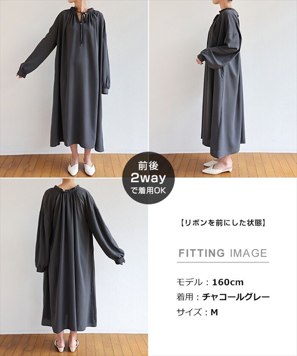 立ち襟 ワンピース フリル とろみ素材 衿ギャザー ボリューム袖 スタンドカラー 前後2way 長袖 ロング 袖ボリューム レディース リボンディティール おしゃれ おすすめ かわいい 可愛い オフィスカジュアル お出かけ デート 楽ちん ゆったり Ladies onepiece ブラック 黒 チャコールグレー テラコッタ ホワイト グリーン