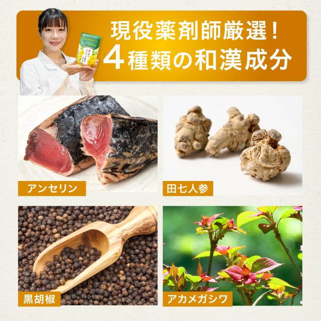 原材料:"菊の花エキス 黒胡椒抽出物 アカメガシワ抽出物 魚肉抽出物 田七人参粉末 緑茶抽出物 結晶セルロース ソルビトール ビタミンB? ビタミンB? ステアリン酸カルシウム HPC CMC 二酸化ケイ素 ビタミンB?