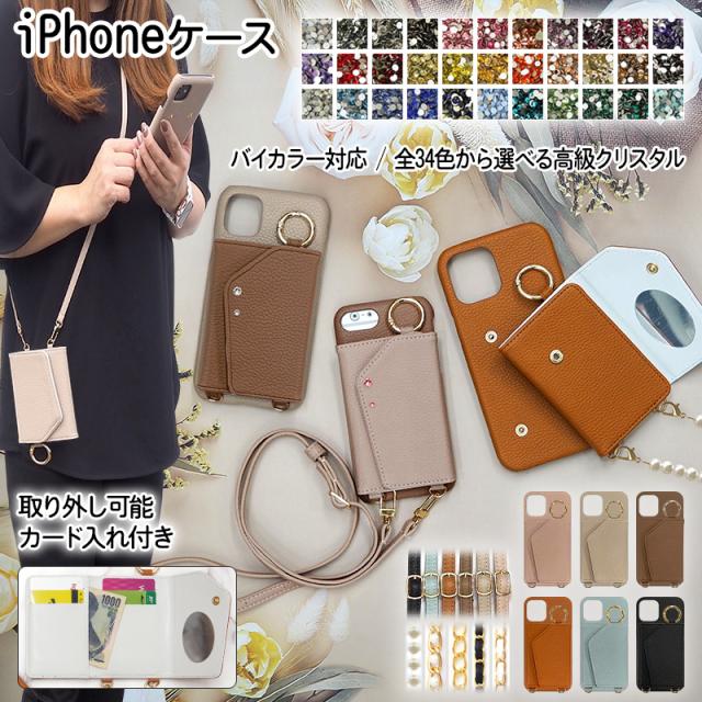スマホケース スマホカバー iPhoneケース【レザー×カード入れ ミラー ロングストラップ付き×スワロフスキー】スマホショルダー背面収納 カード収納 リング付き 肩掛け 首掛け バイカラー ギフト メール便送料無料 受注生産