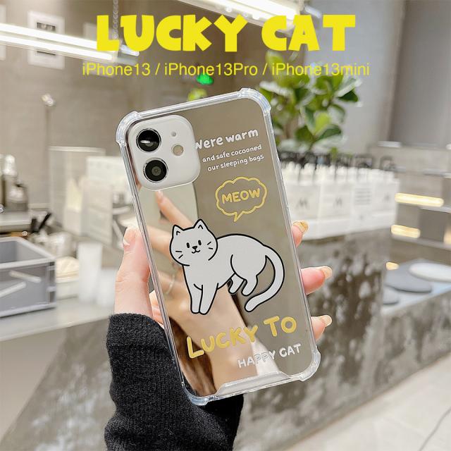 SALE ラッキーキャット iPhone14 iPhone13 ミラーケース iPhone13 iPhone13Pro iPhone13mini 鏡面 ねこ 猫 ネコ 透明 カバー アイフォンケース 送料無料
