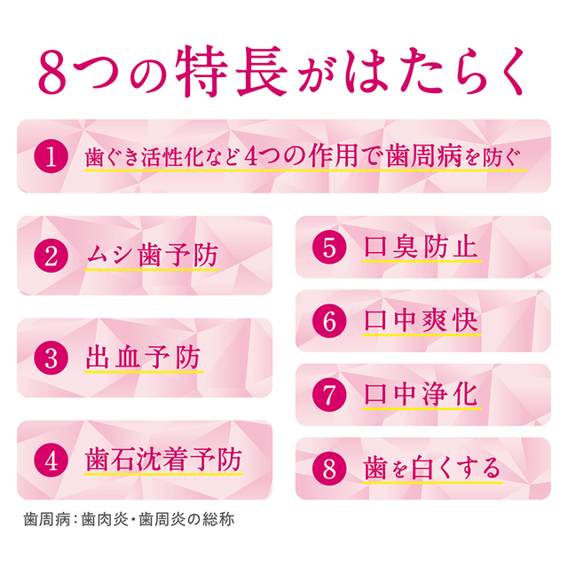 ※2種類から1つお選びください。・歯ぐきを活性化し歯周病を防ぐと共に、8つの機能全部がひとつになった独自のプレミアム処方のデンタルリンス