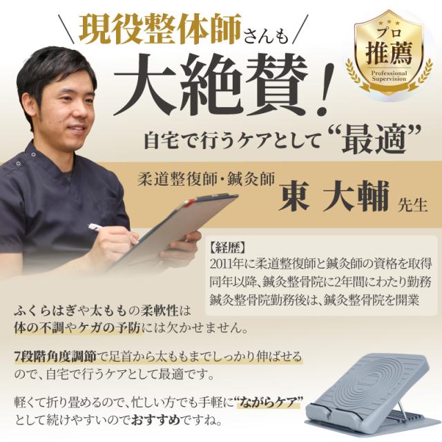 全身をきもちよ〜くのばすことができるストレッチボードです。角度は7段階で調整できるので、目的やその日の体調によって自由に調整できます。ソフトでしなやかな素材でできているので、乗り心地がとても良く、さらにしっかりとした作りなので、安心してご使用いただけます。これ1台でさまざまな使い方ができるので、足首からふくらはぎ、太腿はもちろん、背中や腕まで全身のストレッチをすることができます。耐荷重は150kgありますので、体の大きな方にも十分にお使いいただけます。