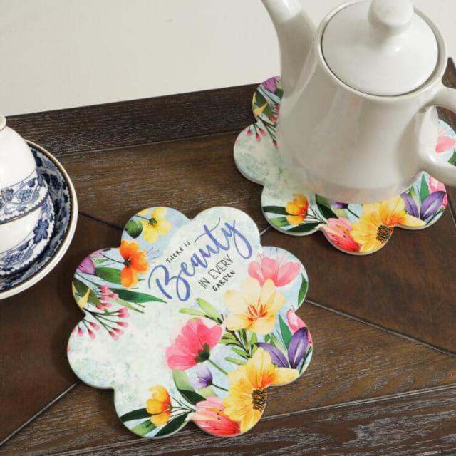 お花のプリントを施したとてもかわいい鍋敷きです。