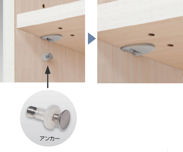 ●イージーロック棚は、アンカーを差し込んで、棚板を乗せるだけで簡単に取り付けができます。