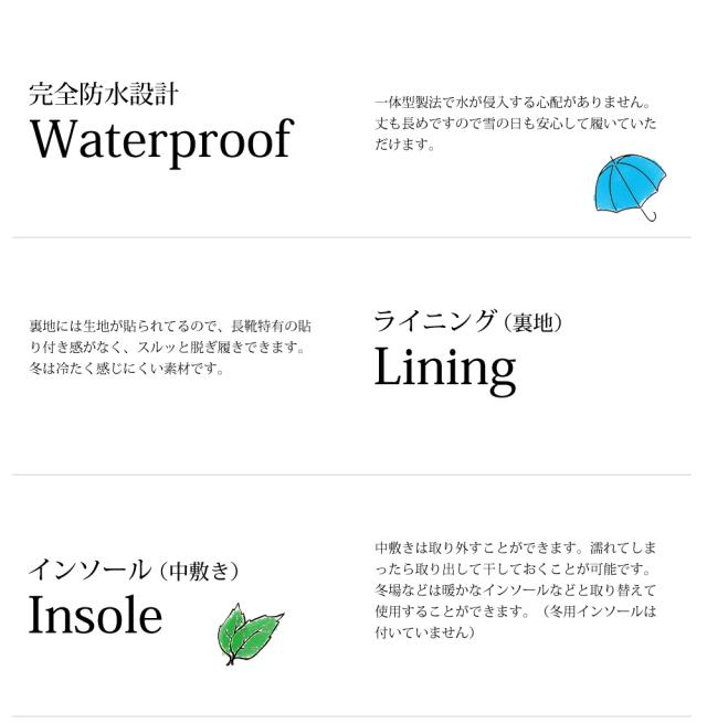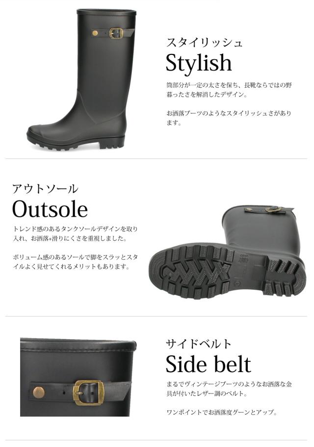| スッキリタイプでお洒落に履ける!スタイリッシュな長靴! 充分な機能性に加え、雨や雪を気にせずおしゃれも楽しめるキレイめレインブーツです。 すっきりとしたシルエットが特徴なこの長靴は、パンツスタイルからスカートスタイルまで幅広いコーディネートに合わせやすく、上品に着こなせます。完全防水設計で水に濡れる心配もなし、グリップ力のあるソールで防滑性も高く、脱ぎ履きしやすい裏地で長靴としての機能もバッチリ!アウトドアでも日常使いでも活躍してくれる万能アイテムです。ロングブーツとして履いていただいても可愛いです◎ |