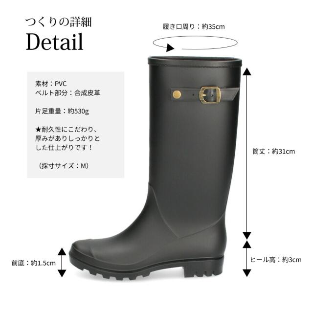 | ヒール:約3.0cm ストーム:約1.5cm 筒丈:約31.0cm 履き口:約35.0cm 片足重量:約530g (Mサイズ採寸) |
