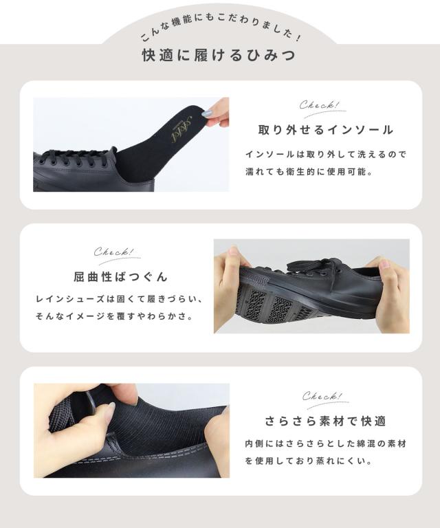 完全防水 晴雨兼用 レインシューズ レディース スニーカー ローカット 2.5cmヒール 洗える 中敷き No.3553 22.5-25.0cm 防滑 屈曲 雨 靴 通勤 通学 蒸れにくい 柔らかい 痛くない 黒 ブラック インソール 取り外せる 衛生的 さらさら AAA+ Feminine サンエープラスフェミニン