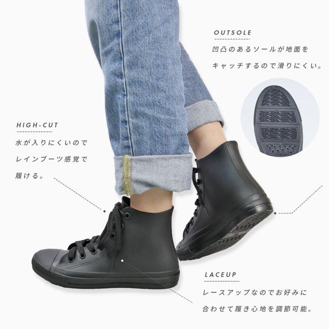 ハイカットタイプなので幅広いスタイルに合わせやすく、急な雨でも安心です。