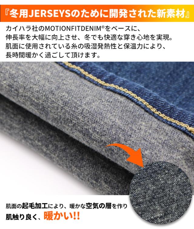 | よく伸びてよく戻る、抜群の伸長回復率をもったカイハラ社のモーションデニムをベースに、伸長率を大幅に向上させ、快適な穿き心地を誇るジャージーズ。こちらは従来の生地よりレーヨンを1.5倍使用することで、ソフトでしなやかな肌触りを実現し、暖かをプラスしています。 |