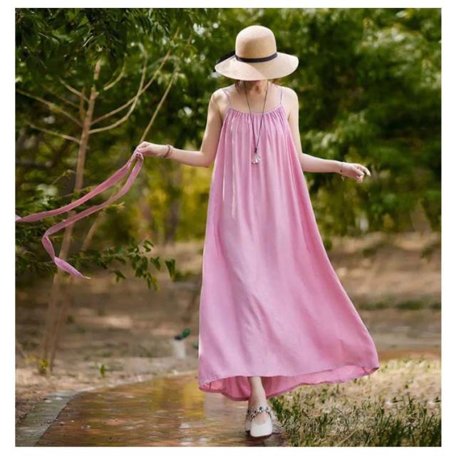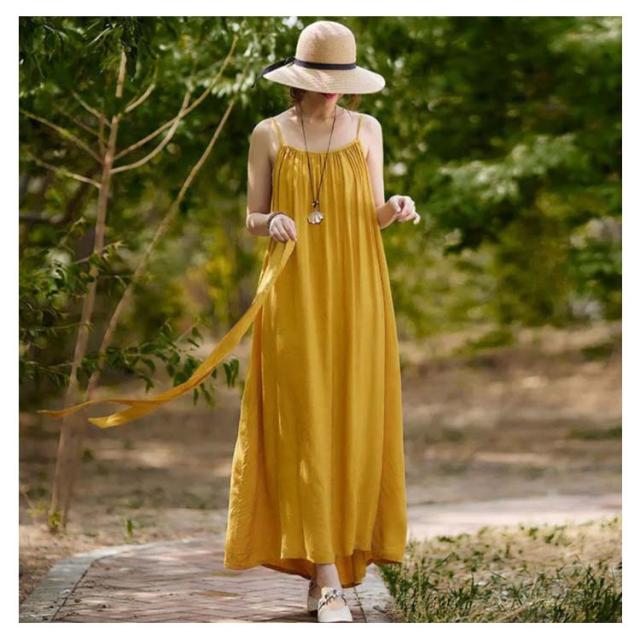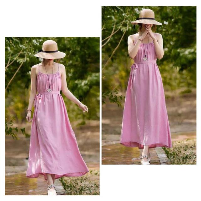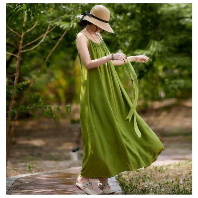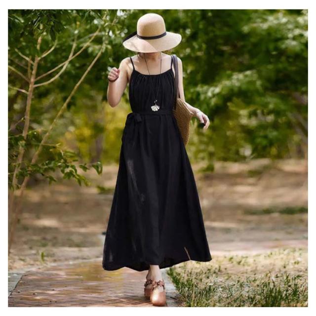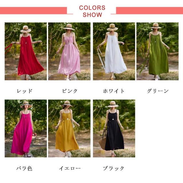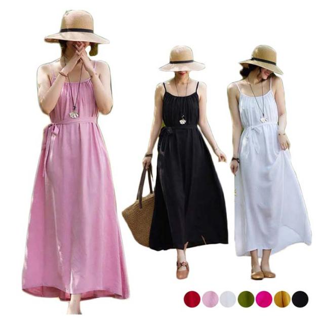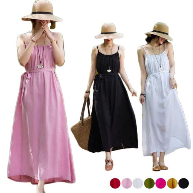 着痩せ ノースリーブ ロングキャミソール シンプル 夏 キャミソール ビーチワンピース ゆったり 丸襟 ベルト付き ミモレ丈 ロングキャミソール フレアワンピース 送料無料 無地 コットン カジュアル 旅行最適 レディース