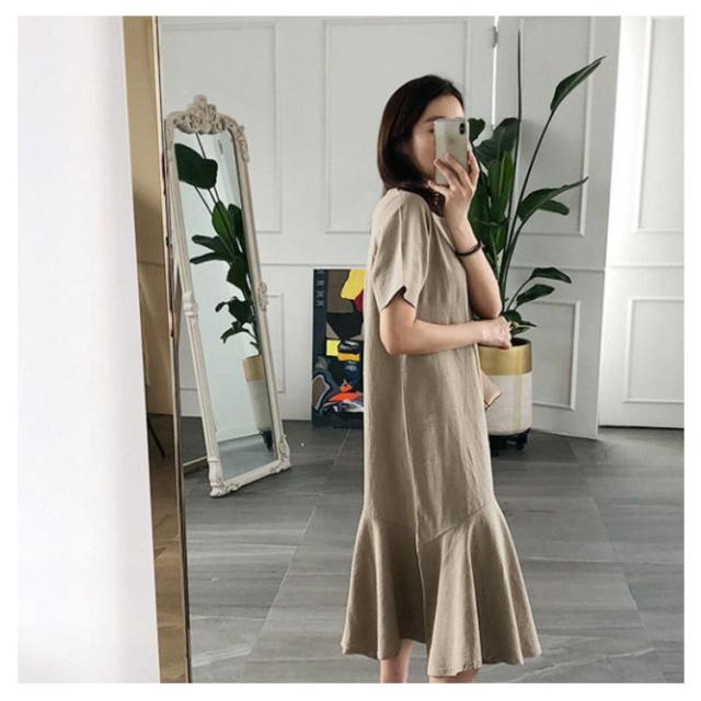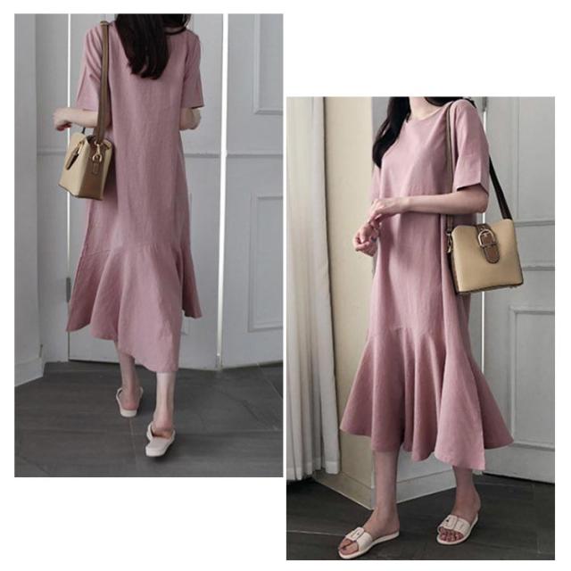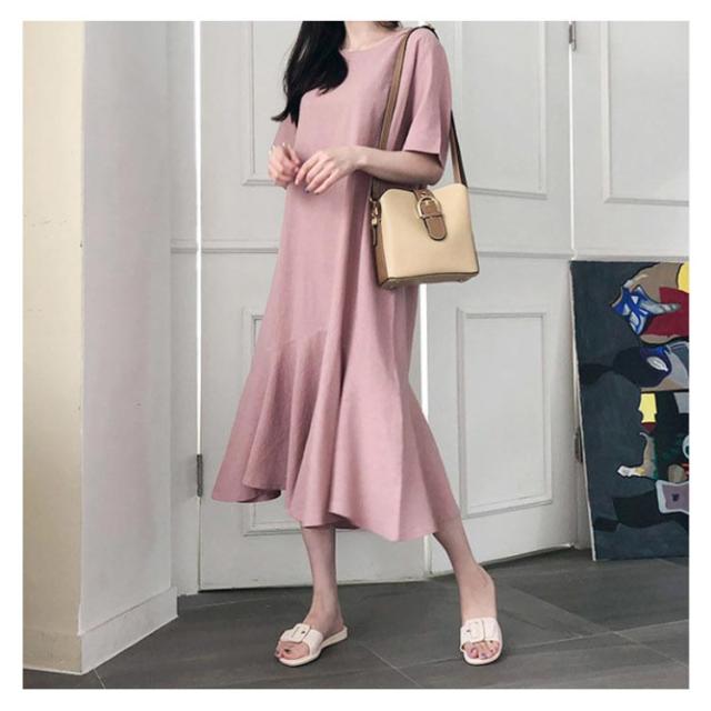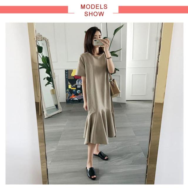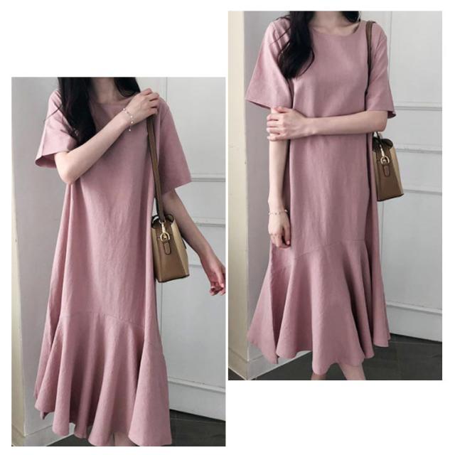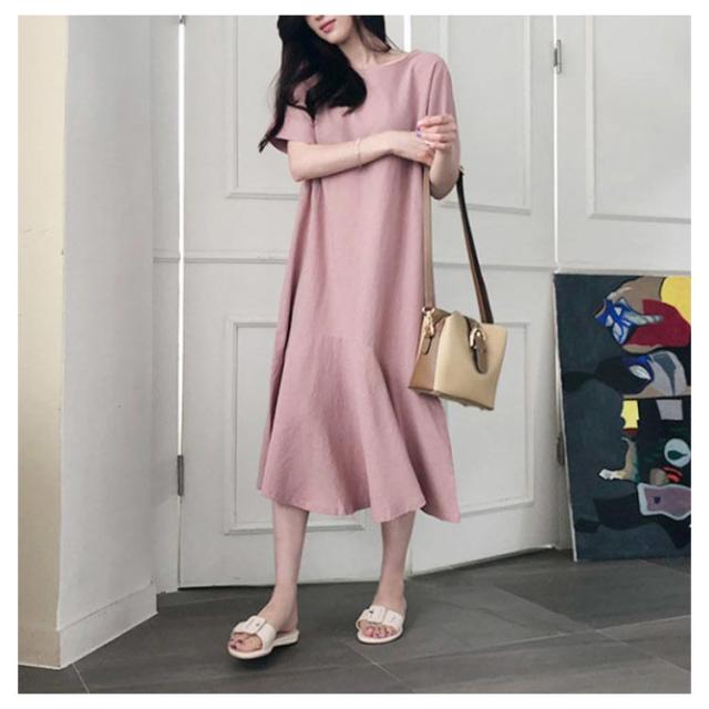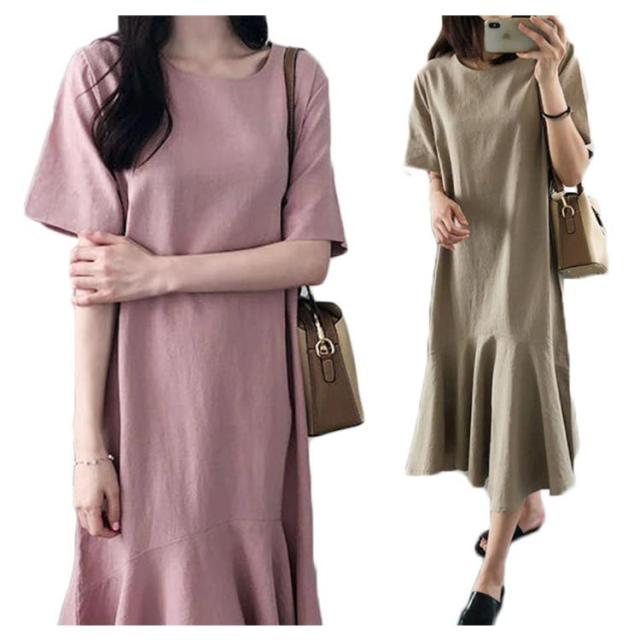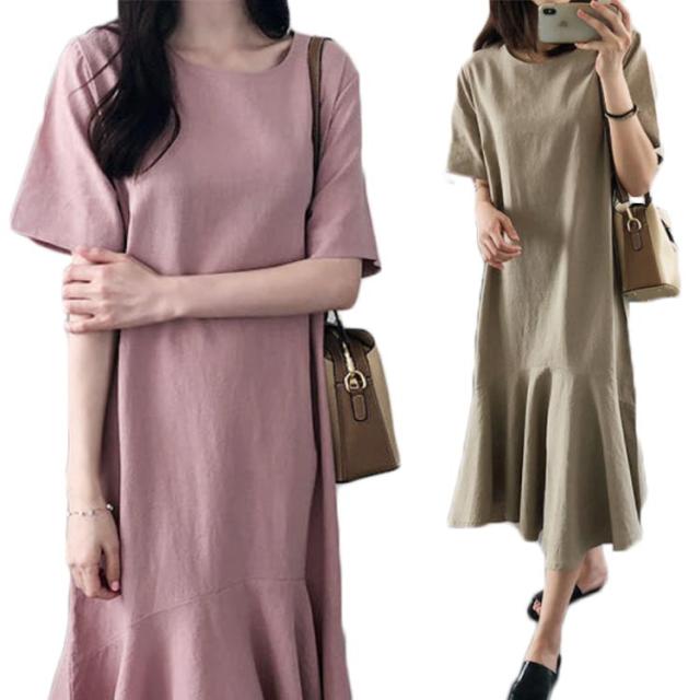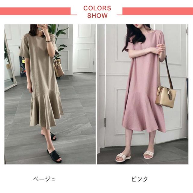 無地 無地 ロングワンピース 送料無料 膝下 半袖 マキシワンピース ミモレ丈 レディース ゆったり 大きサイズ ロングワンピース コットン フリルワンピース 丸襟 フレアワンピース サマーワンピース シンプル 夏