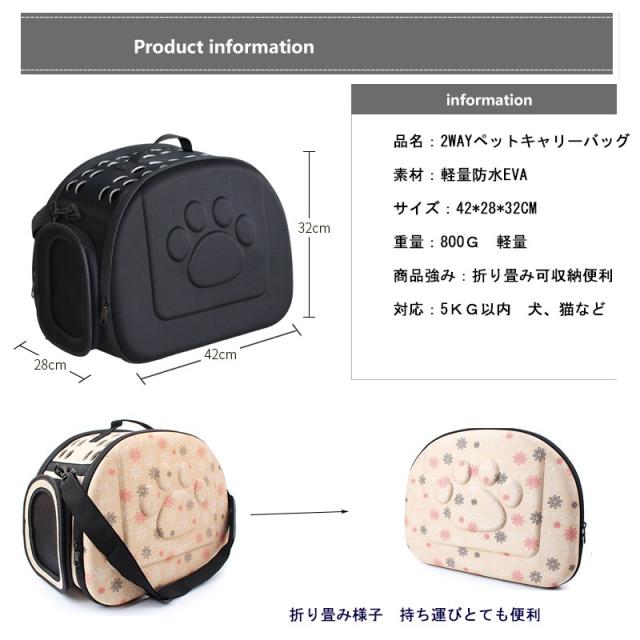 | サイズについての説明 | 犬猫ちゃんお散歩やお出かけ、旅行や動物病院への移動時に便利に使用するキャリーバッグです。 サイズ:展開28*42*32 折りたたみ可 対応ペット:5KG以内 すべて対応できる。 重量:800G とても軽量です。 |