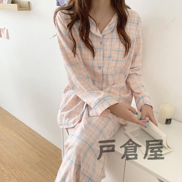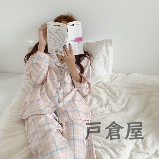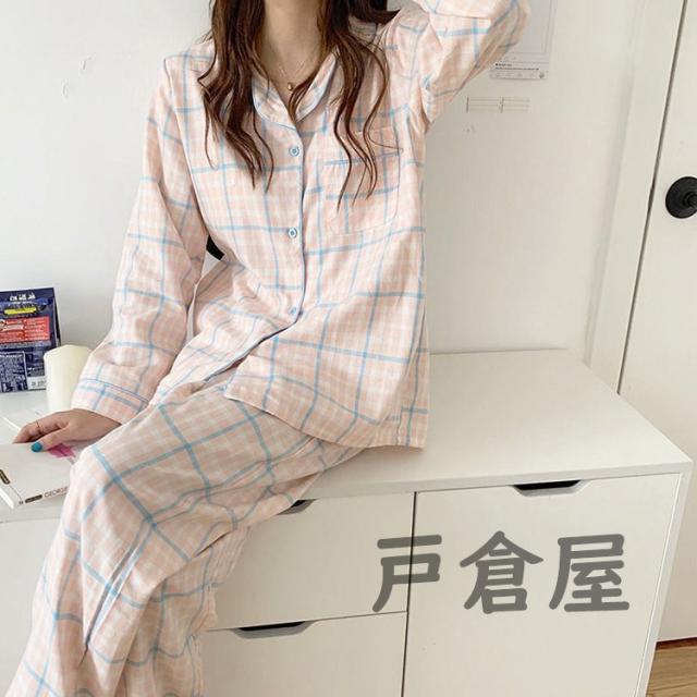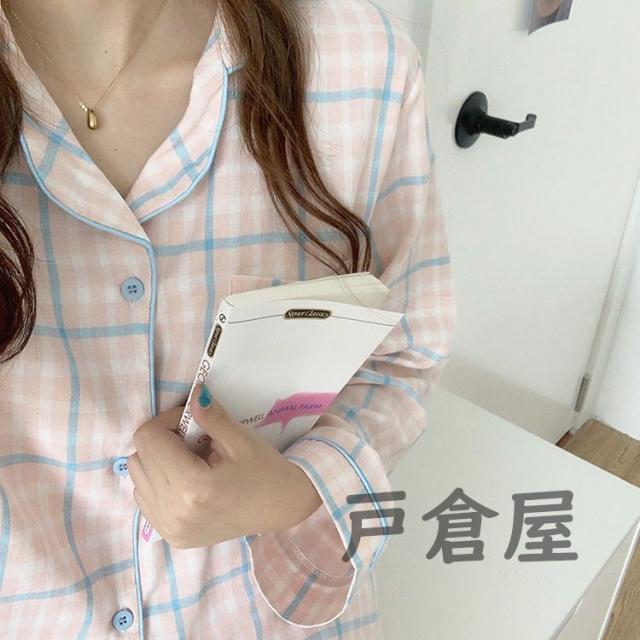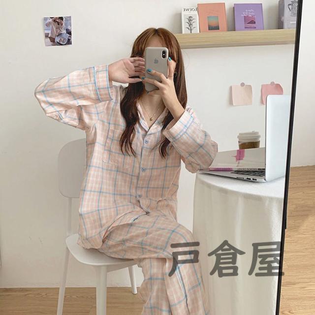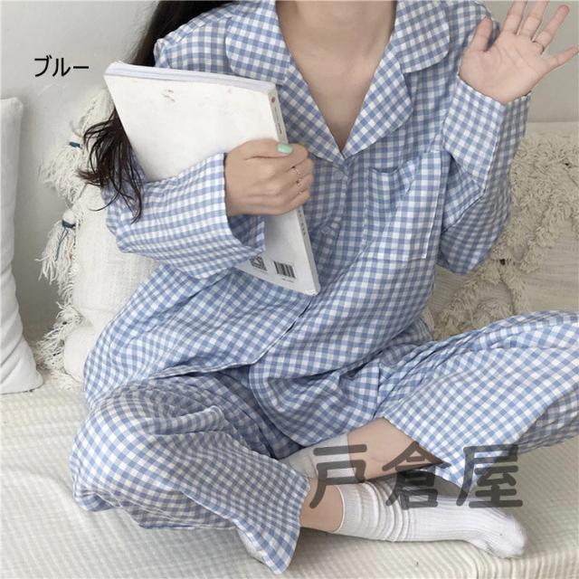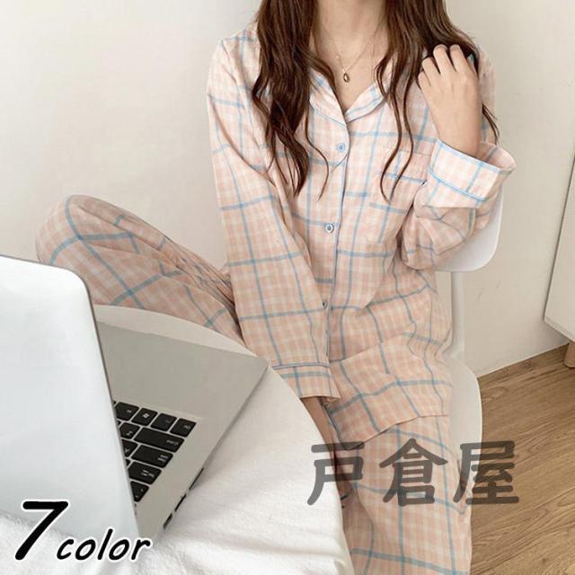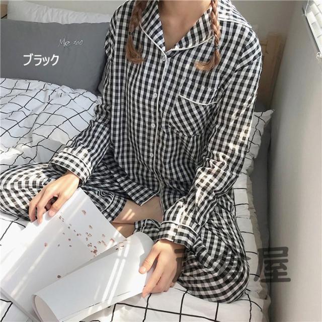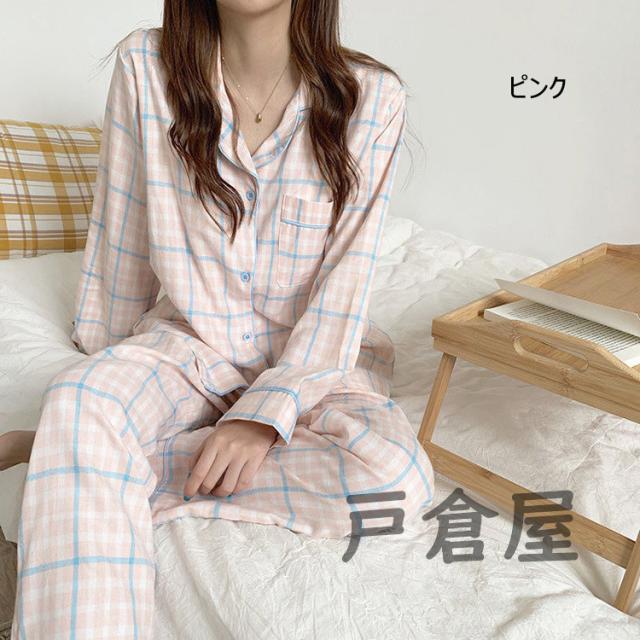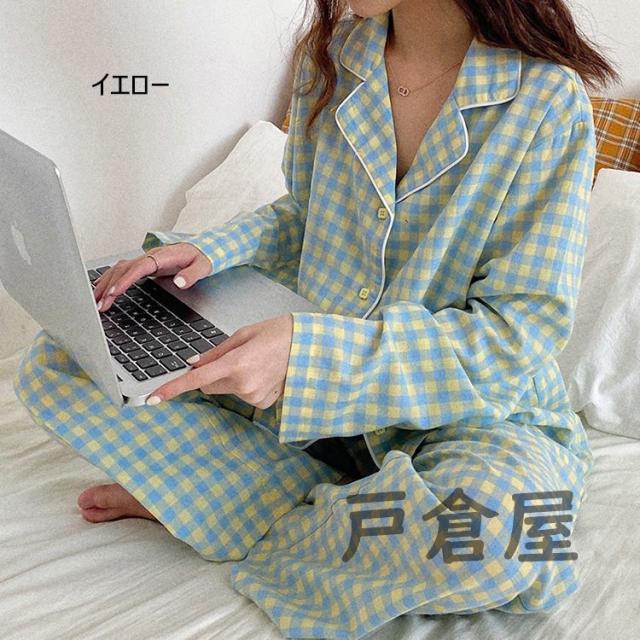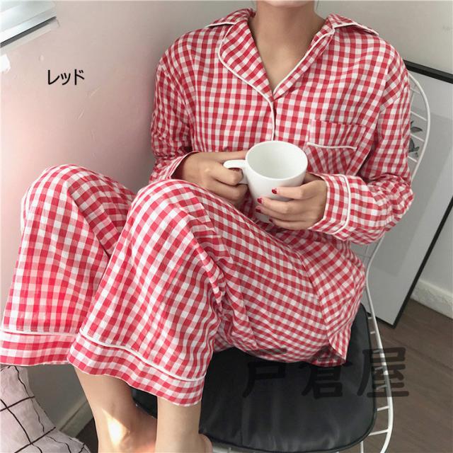 レディース ルームウェア 春夏秋 長袖 前開きルームウェア パジャマ パジャマ 可愛いチェック柄 大きいサイズ 上下セット部屋着 パジャマ