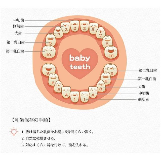 | サイズについての説明 | セット内容:1×歯ケース、1×抜けた日シール、1×脱脂綿、1×ピンセット、1×日本語誕生記録シール、1×うぶ毛ミニボトル 重さ:0.35kg サイズ:15cm*12cm*3.7cm ※商品によって誤差やタグ表記と異なる場合はご了承ください 大切なお子様の抜けた歯を記念に取っておける乳歯ケースです! 【オススメのポイント】 ★お子様の乳歯20本すべて収納可能です。歯を入れる穴は歯の並びに対応していますので、いつ抜けたのかがが一目瞭然! ★大切なお子様の乳歯、一本一本丁寧に保管することができ、子どもの成長も実感できます。 ★手作りの木製品で、精密でありながら耐久性もあります。 ★湿気に強い、通気性の良い素材を採用し、長時間保存できます。 【乳歯保存の手順】 1. 抜け落ちた乳歯をお湯に5分間くらい置く。 2. 自然に乾燥させる。 3. 対応する穴に綿を付けて、歯を入れる。 【記念を残す一品】 ★歯の生え変わりは大人への一歩、子供の成長過程の一つですから親として大切にしたいですね。 歯の抜けた思い出をお子様の成長としてしっかりと記録しましょう |