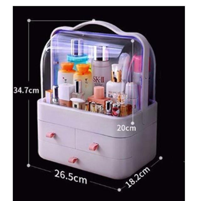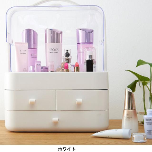| サイズについての説明 | 大容量のメイクボックスはコスメをスッキリ収納 大容量の収納力がある上段に加え、中段・下段の引き出しが3つあるのでコスメを分類して収納できます。 上段部は前後で開け閉めするこができ、内部は3つに仕切られて、手前に小さい仕切りが2つ、奥に大きい仕切りがあります。 上段部分が透明で高さ20cmあるから化粧水や香水のボトルを並べて飾ることができます。 (注意:上段の透明部分にストッパーが付いているので前後同時には開きません。) 中段・下段の3つの引き出しの取っ手部分は引っ張りやすいゴム製のやわらかい素材で出来ています。 防水機能付き 液体やパウダーでも汚れても水洗いできるので清潔に保てます。 中段は引き出し2つ、下段は引き出し1つあり、引き出し取りはずし可能でお手入れしやすい。 取っ手色はホワイト、ピンク の2色が付属しております。 気分により自由に取っ手を変えられます。 商品名:メイクボックス 商品サイズ:W 26.5 cm × D 18.2 × H 34.7 cm 商品重量:約 1.94 kg 素 材:ABS |