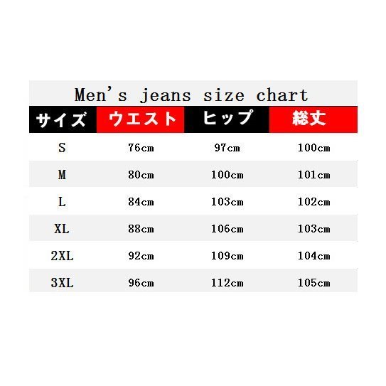 | サイズについての説明 | ▲人気のデニムパンツが登場!! ▲デザインも個性的で、綺麗! ▲カラー:ダークブルー ブラック グレー ▲サイズ:S M L XL 2XL 3XL |