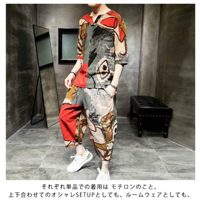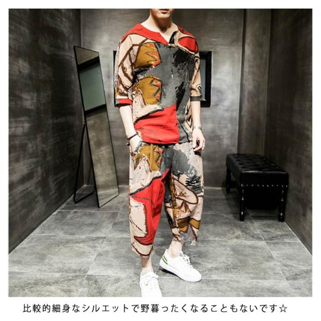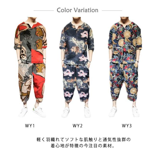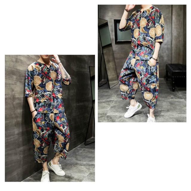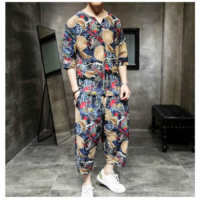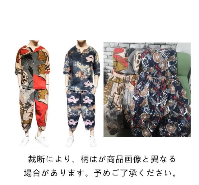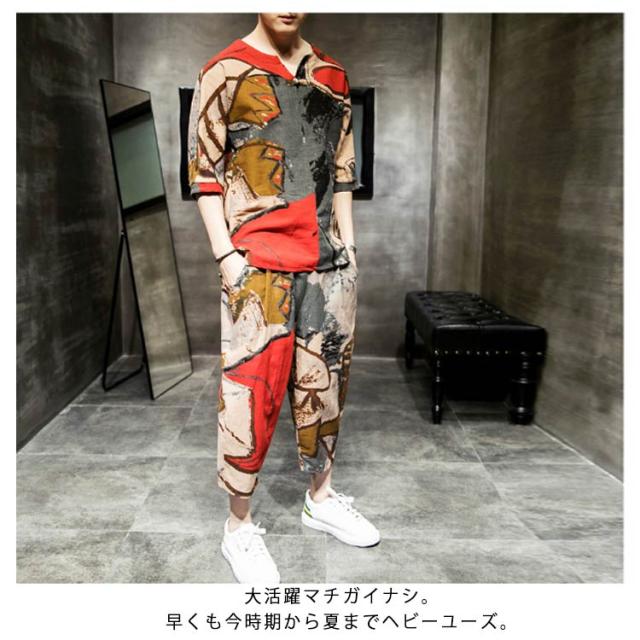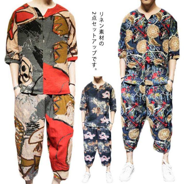 セットアップ セットアップ 綿麻 夏祭り 2点セット 花柄 父の日ギフト 半袖Tシャツ&ショートパンツ 花火大会 おしゃれ 大きいサイズ メンズ メンズ