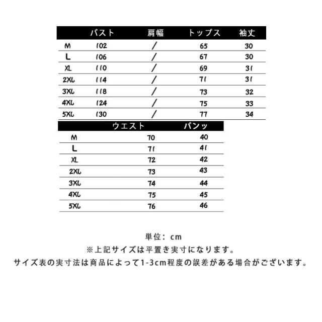 | サイズについての説明 | トップス M バスト102cm 着丈65cm 袖丈30cm L バスト106cm 着丈67cm 袖丈30cm XL バスト110cm 着丈69cm 袖丈31cm 2XL バスト114cm 着丈71cm 袖丈31cm 3XL バスト118cm 着丈73cm 袖丈32cm 4XL バスト124cm 着丈75cm 袖丈33cm 5XL バスト130cm 着丈77cm 袖丈34cm ボトムス M ウエスト70-73cm 着丈70cm 脚幅40cm L ウエスト76.5-80cm 着丈71cm 脚幅41cm XL ウエスト80-86.5cm 着丈72cm 脚幅42cm 2XL ウエスト86.5-93cm 着丈73cm 脚幅43cm 3XL ウエスト96.5-103cm 着丈74cm 脚幅44cm 4XL ウエスト106.5-110cm 着丈75cm 脚幅45cm 5XL ウエスト110-116cm 着丈76cm 脚幅46cm ●サイズ詳細等の測り方はスタッフ間で統一、徹底はしておりますが、実寸は商品によって若干の誤差(1cm〜3cm )がある場合がございますので、予めご了承ください。 |