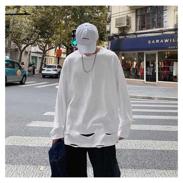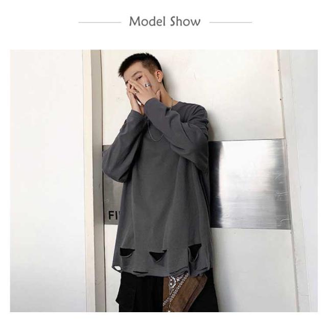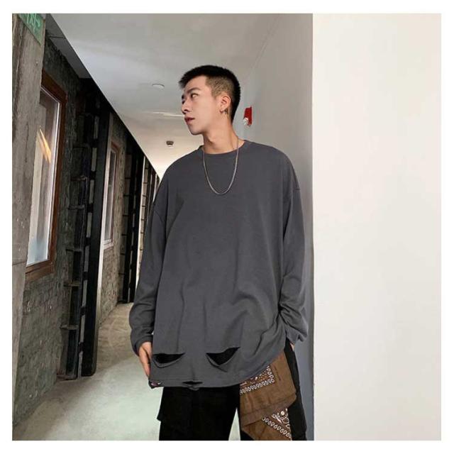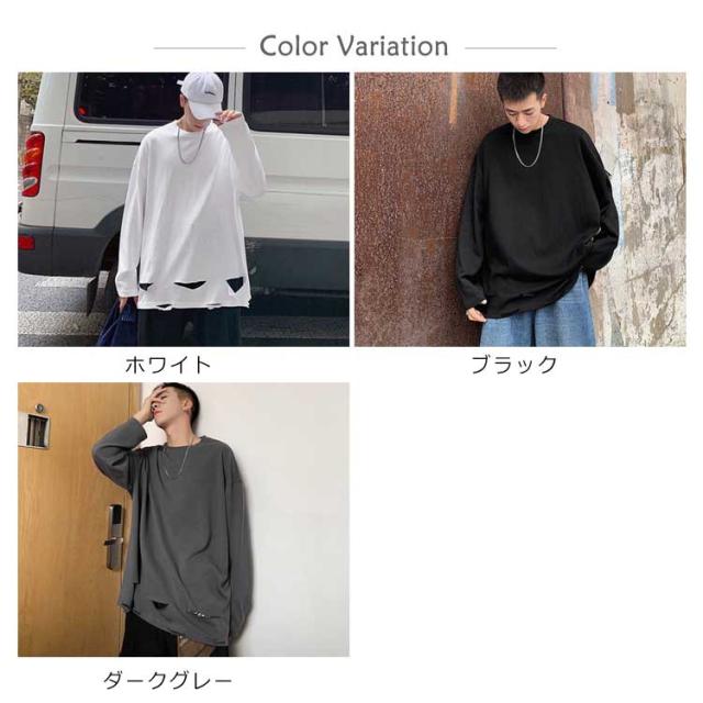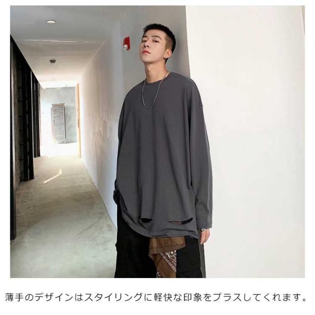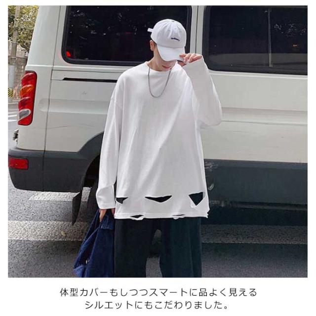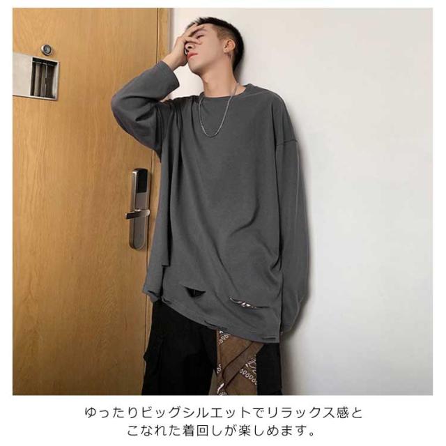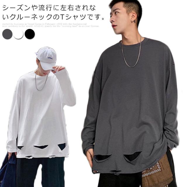 カジュアル Tシャツ 柔らかい クルーネック ゆったり カットソー メンズ 長袖 プルオーバー ダメージ加工 体型カバー Tシャツ 秋春夏 トップス