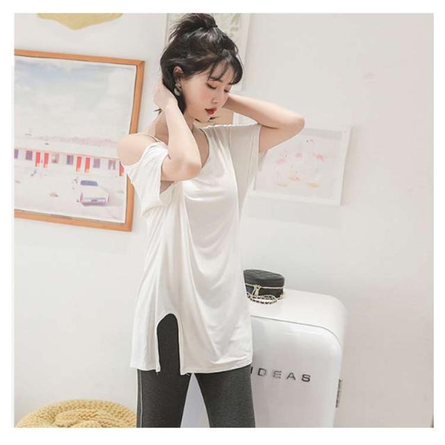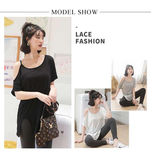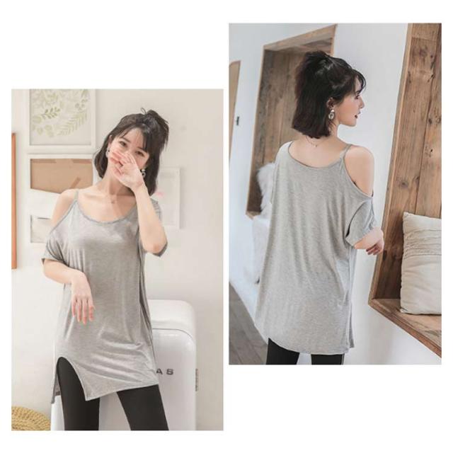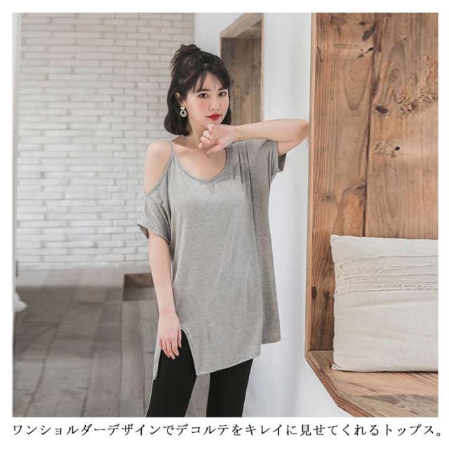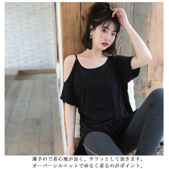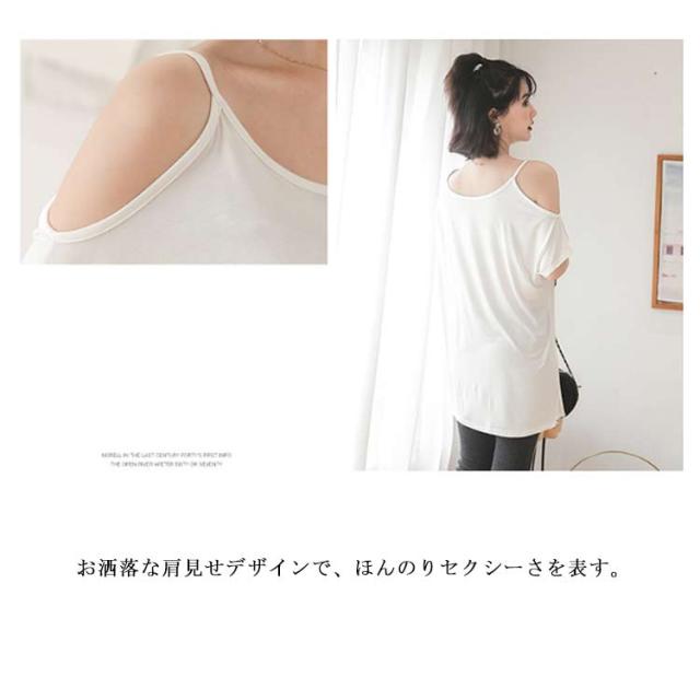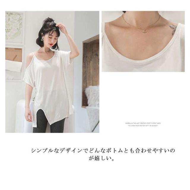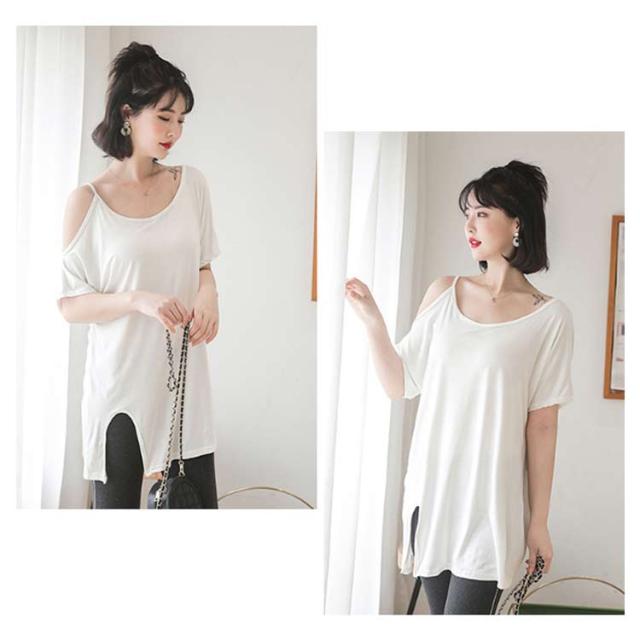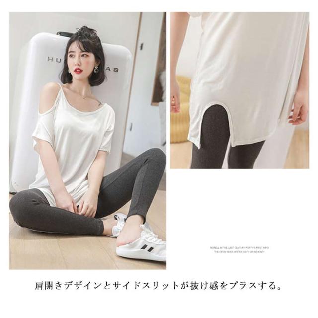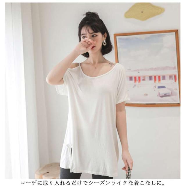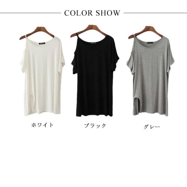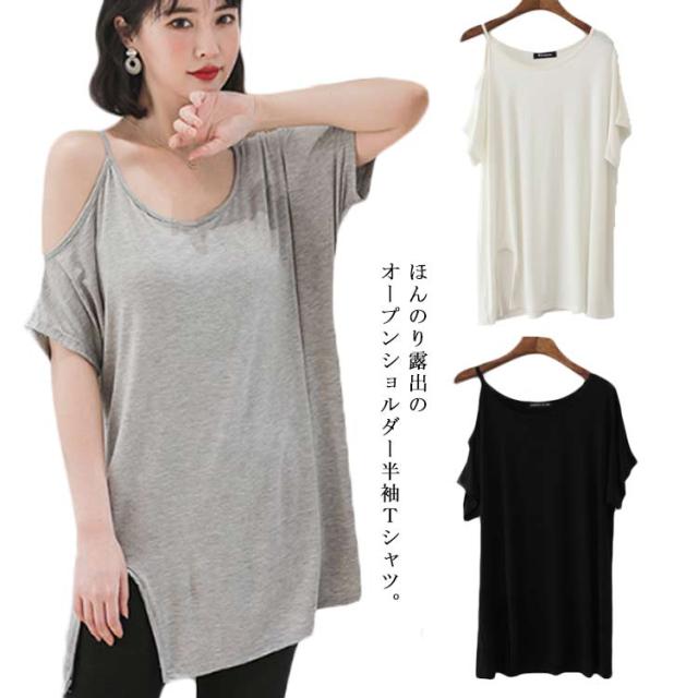 送料無料 半袖 薄手 肩だし スリット Tシャツ カットソー クルーネック モダール ロングTシャツ レディース ワンショルダーカットトップス 無地 ロングT ゆったり オフショル 肩見せ プルオーバー お洒落 カジュアル 送料無料